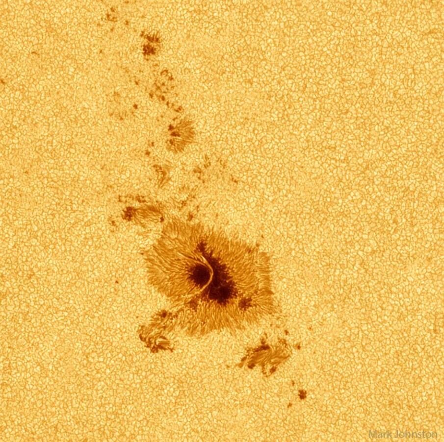 لکههای خورشیدی ممکن است اندازهای بزرگتر از زمین داشته باشند و معمولاً حدود یک هفته روی سطح خورشید دوام میآورند. در تصویر زیر بخشی از منطقه فعال AR ۳۲۹۷ را میبینیم که اوایل ماه مه از سطح خورشید عبور کرد. پل نوری معلقی از جنس گاز داغ خورشیدی روی لکه بزرگ پایینی بسته شده است.