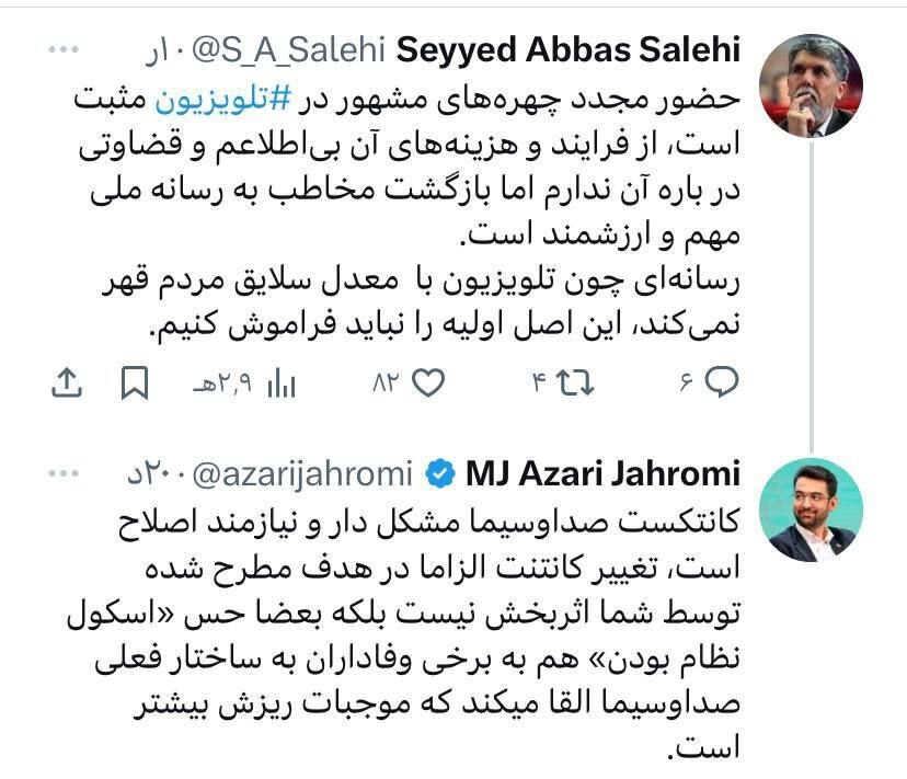 سید عباس صالحی و محمد جواد آذری جهرمی وزرای فرهنگ و ارشاد اسلامی و ارتباطات و فناوری اطلاعات با انتشار متن هایی نظرات خود را درباره برنامه های نوروزی صدا و سیما به اشتراک گذاشتند.