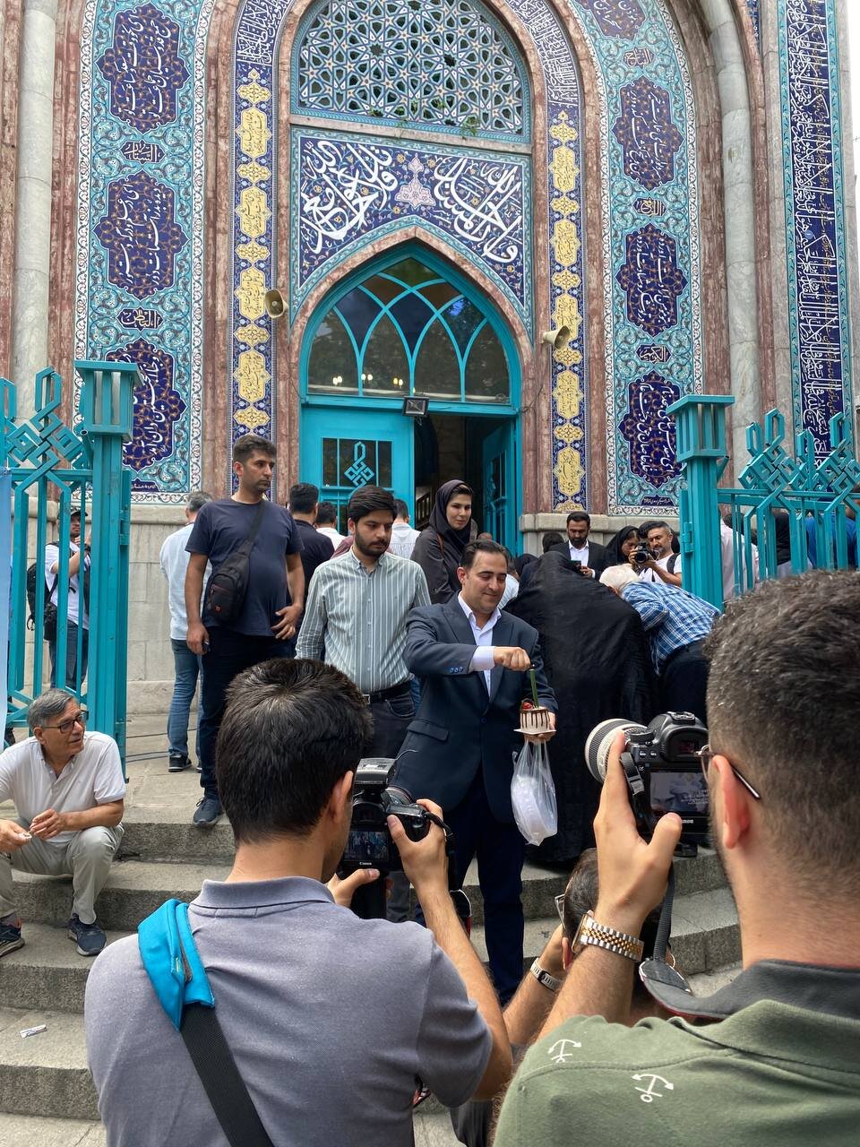 فردی که با یک کیک به درب ورودی حسینیه ارشاد نزدیک شد قبل از ورودش شمع روی کیک را فوت کرد این اقدام توسط عکاسان ثبت شد.