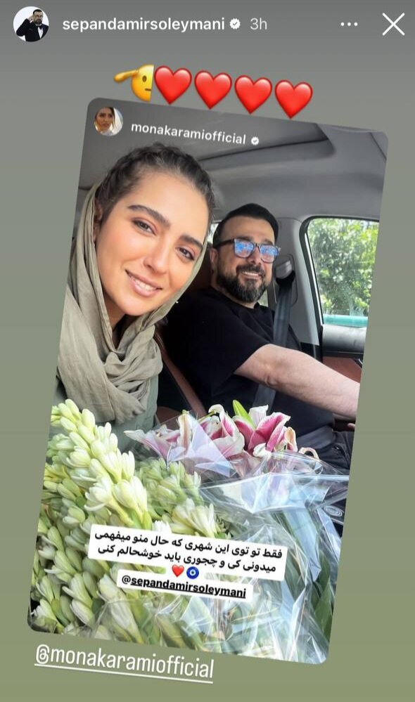 مونا کرمی، همسر سپند امیرسلیمانی بازیگر سینما و تلویزیون عکس عاشقانهای به همراه همسرش را در صفحه اجتماعی خود منتشر کرد.