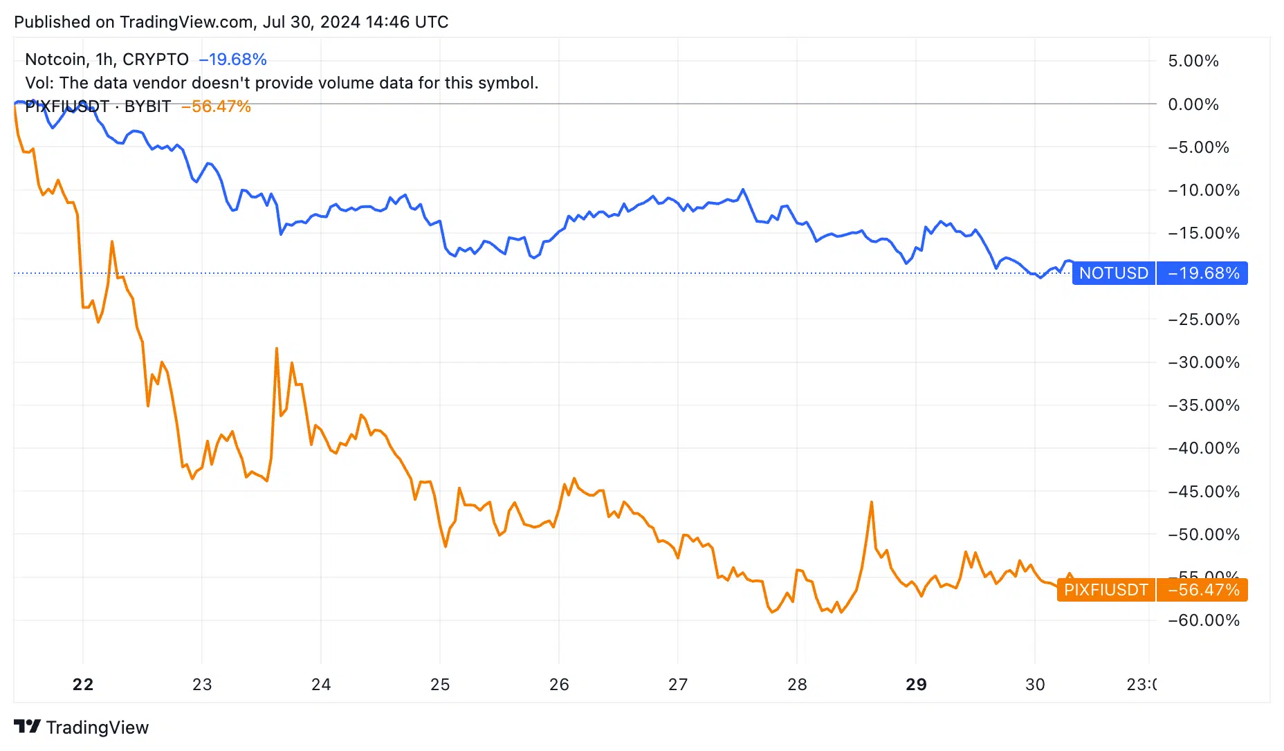 بررسی دادهها حاکی از آن است که توکنهای محبوب Notcoin، Avacoin و Pixelverse پس از فهرست شدن، عملکرد خوبی نداشتهاند؛ Notcoin که در ماه می فهرست شد، با 55.8 درصد کاهش به 0.012 دلار رسید. حتی پس از اقدامات اخیر برای رشد اکوسیستم، ارزش بازار آن از بیش از 2.5 میلیارد دلار به 1.32 میلیارد دلار کاهش یافته است. به طور مشابه، ارزش توکن Pixelverse (PIXFI) به 0.030 دلار کاهش یافته است که 70 درصد از بالاترین نقطه خود در این ماه پایینتر است و ارزش بازار آن را به 160 میلیون دلار کاهش پیدا کرده است.