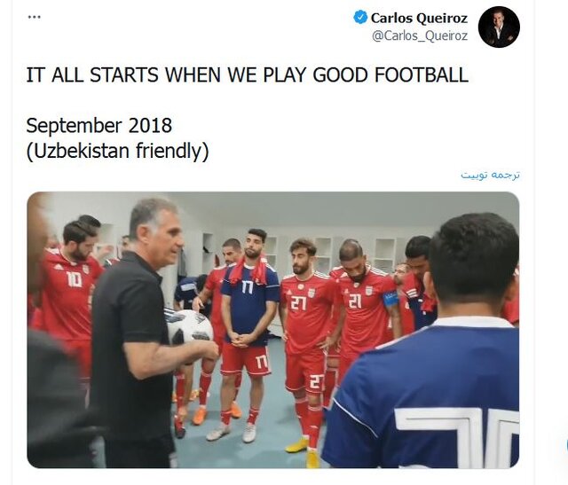کارلوس کیروش دقایقی پس از اینکه مهدی تاج اعلام کرد قصد جدی برای برگرداندن این مربی پرتغالی دارد، ویدیویی از رختکن تیم ملی ایران در صفحه اینستاگرامش منتشر کرد و نوشت: «همه چیز از زمانی شروع می شود که ما فوتبال خوبی بازی کنیم.»