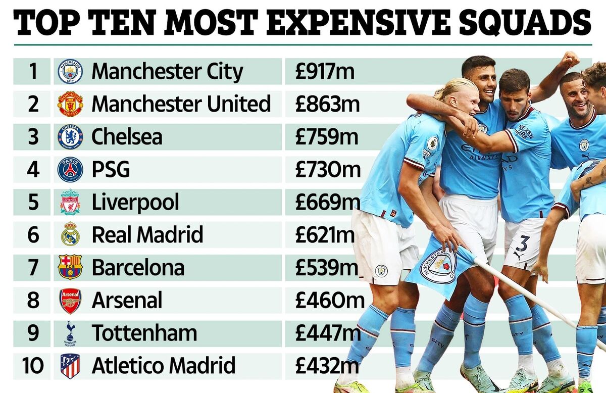 منچسترسیتی قهرمان فصل قبل لیگ برتر انگلیس در صدر قرار دارد و ارزش بازیکنانشان ۹۱۷ میلیون پوند است. عجیب نیست چرا که این تابستان ارلینگ هالند (۵۱ میلیون پوند)، کالوین فیلیپس (۴۵ میلیون پوند)، سرخیو گومس (۱۱ میلیون پوند) و مانوئل آکانجی (۱۵ میلیون پوند) را خریدهاند.