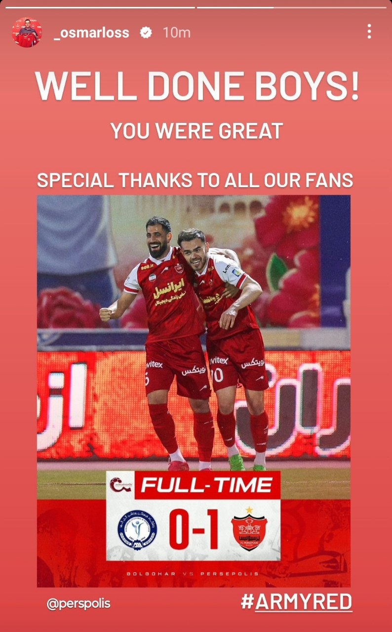 خبرآنلاین: پرسپولیس شب گذشته موفق شد گل گهر را در سیرجان شکست بدهد و به یک امتیازی استقلال در صدر جدول برسد. اوسمار ویرا در این بازی با کارت زرد و قرمز موعود بنیادی فر جریمه و از کنار زمین اخراج شد. او یک استوری در اینستاگرام منتشر کرد و نوشت: