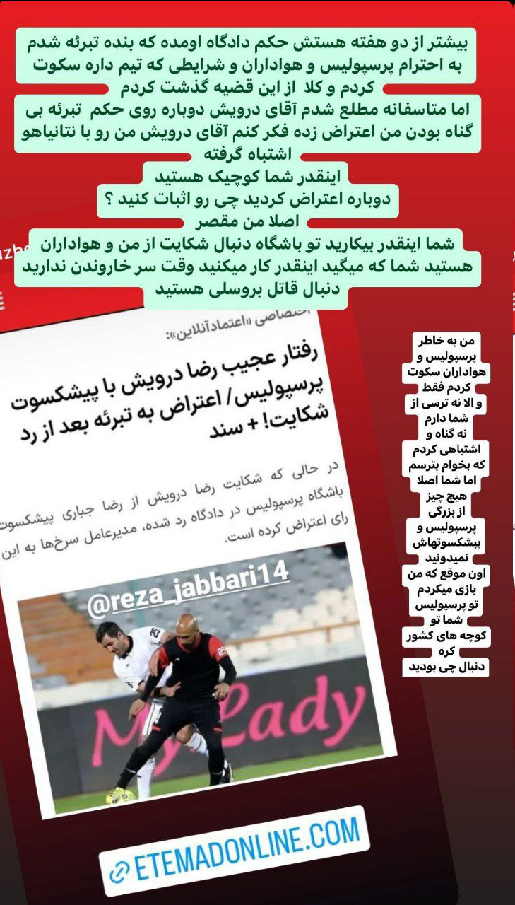 مدتی پیش رضا درویش مدیرعامل باشگاه پرسپولیس علیه رضا جباری پیشکسوت این باشگاه در دادسرای فرهنگ و رسانه با ادعای توهین به «اشخاص عادی» و «نشر اکاذیب» شکایتی را به ثبت رساند.