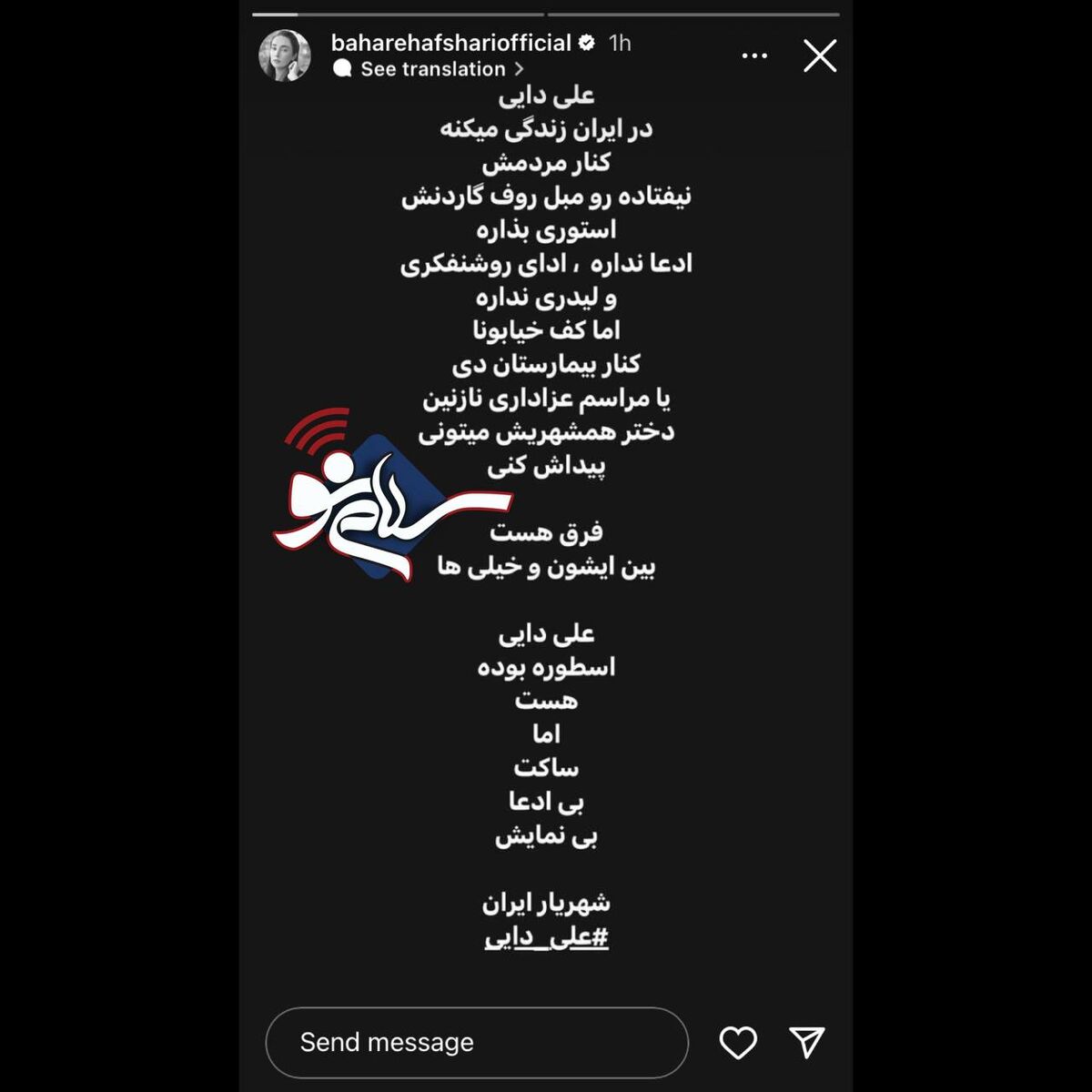 بهاره افشاری بازیگر سینما و تلویزیون از علی دایی دفاع کرد.