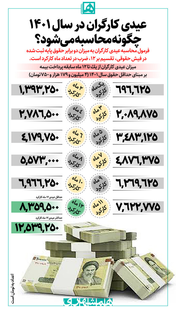 اینفوی زیر میزان عیدی کارگران از یک ماه سابقه پرداخت بیمه تا ۱۲ ماه کامل را نشان می دهد. عیدی محاسبه شده بر مبنای حداقل حقوق سال ۱۴۰۱ یعنی ۴ میلیون و ۱۷۹ هزار و ۷۵۰ تومان است. عیدی سایر کارگران دارای بیش از یک سال سابقه نیز همین طور محاسبه می شود اما حقوق پایه ثبت شده در فیش حقوقی آنها، مبنای محاسبه عیدی خواهد بود.