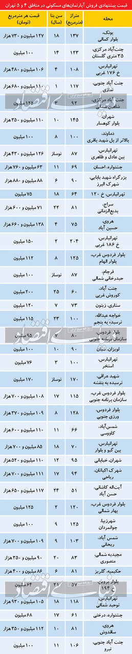 روزنامه دنیای اقتصاد جدول قیمت مسکن در مناطق 4و5 را منتشر کرده است.