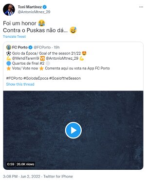 تونی مارتینز در واکنش به رقابت با طارمی در توییتر خود به طنز نوشت: این یک افتخار است که با تو مقایسه میشوم. مقابل تو که نامزد پوشکاش شدی رقابت سخت است.