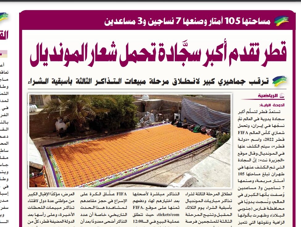 نشریه قطری اعلام کرد این فرش بزرگ ایرانی در جام جهانی ۲۰۲۲ در معرض دید کل دنیا قرار میگیرد.
