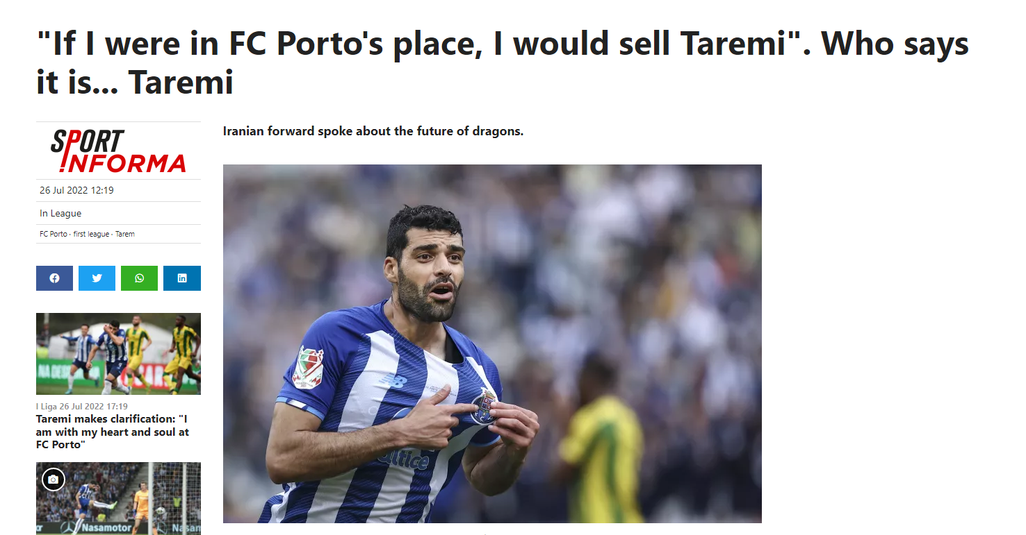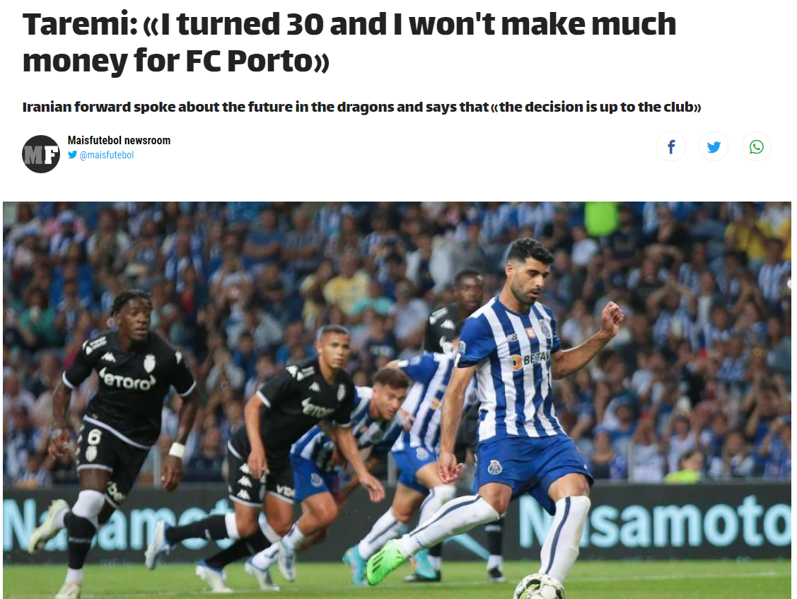 مطبوعات پرتغال بیشتر از هر چیزی روی این صحبت طارمی که در خصوص آیندهاش در پورتو صحبت کرد، متمرکز شدند. طارمی در مصاحبه خود گفت: من در حال 30 ساله شدن هستم و قطعا در آینده دستاورد زیادی نمیتوانم برای پورتو داشته باشم و از لحاظ مالی بخواهم بگویم، باشگاه میتواند با حفظ جوانان خود در سالهای پول بیشتری از فروش بدست آورد. اما شرایط من متفاوت است و نمیتوانند مرا نگه دارند و مثلا 2 سال دیگر بفروشند.