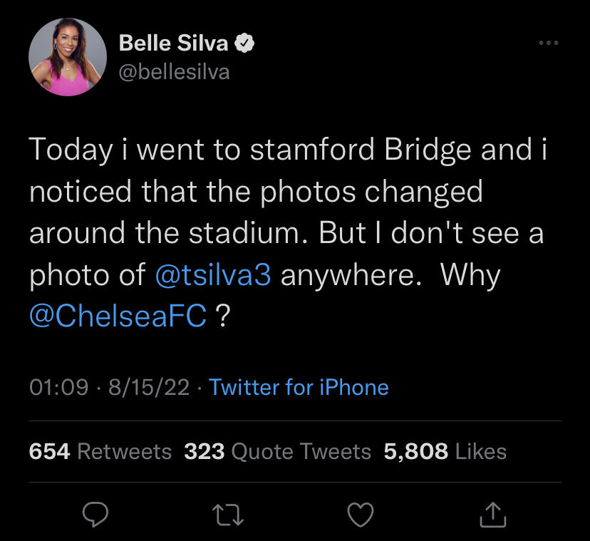 بلا سیلوا، همسر مدافع چلسی که روز شنبه برای تماشای دیدار این تیم با تاتنهام راهی استمفوردبریج شده بود، پس از بازی در توییتی از باشگاه چلسی انتقاد کرد: «امروز به استمفوردبریج رفتم و متوجه شدم عکسهای اطراف ورزشگاه عوض شدهاند اما عکسی از تیاگو سیلوا ندیدم. چرا؟»