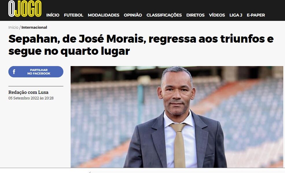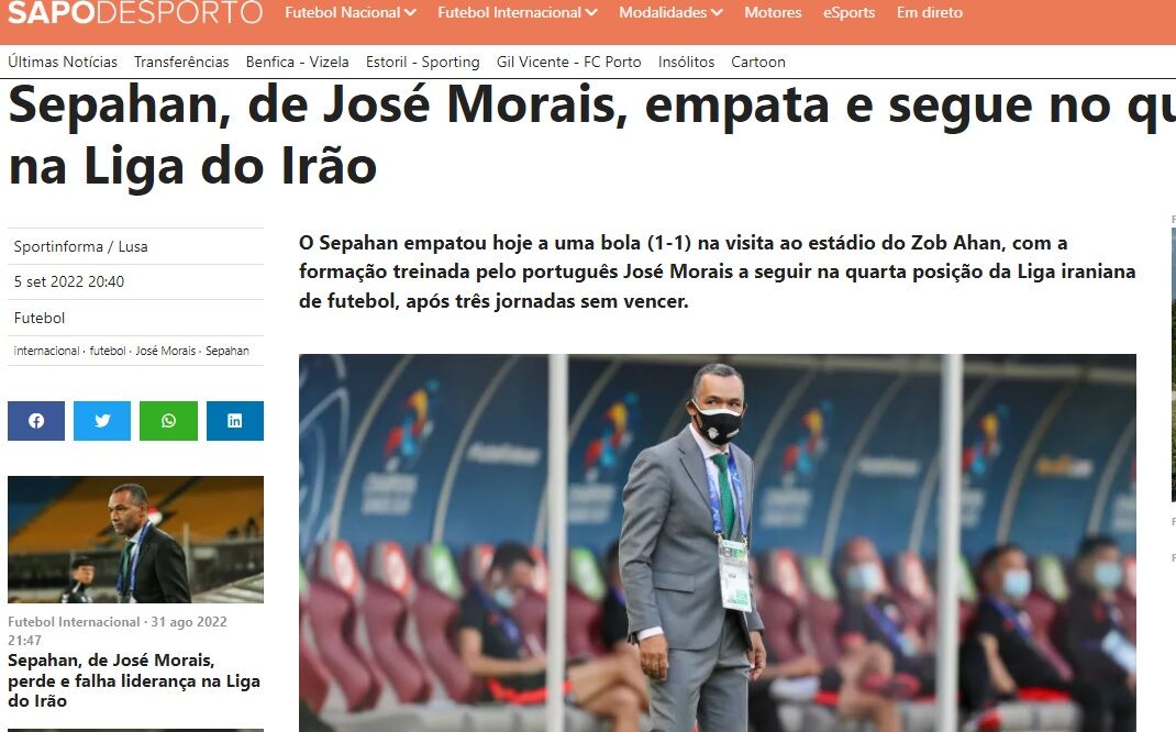 نشریه «desporto» پرتغال هم نوشت: مورایس همچنان از رسیدن به پیروزی در ۳ بازی اخیر با سپاهان ناکام ماند و با گذشت ۵ هفته از لیگ ایران با کسب ۸ امتیاز در رده چهارم ماند.