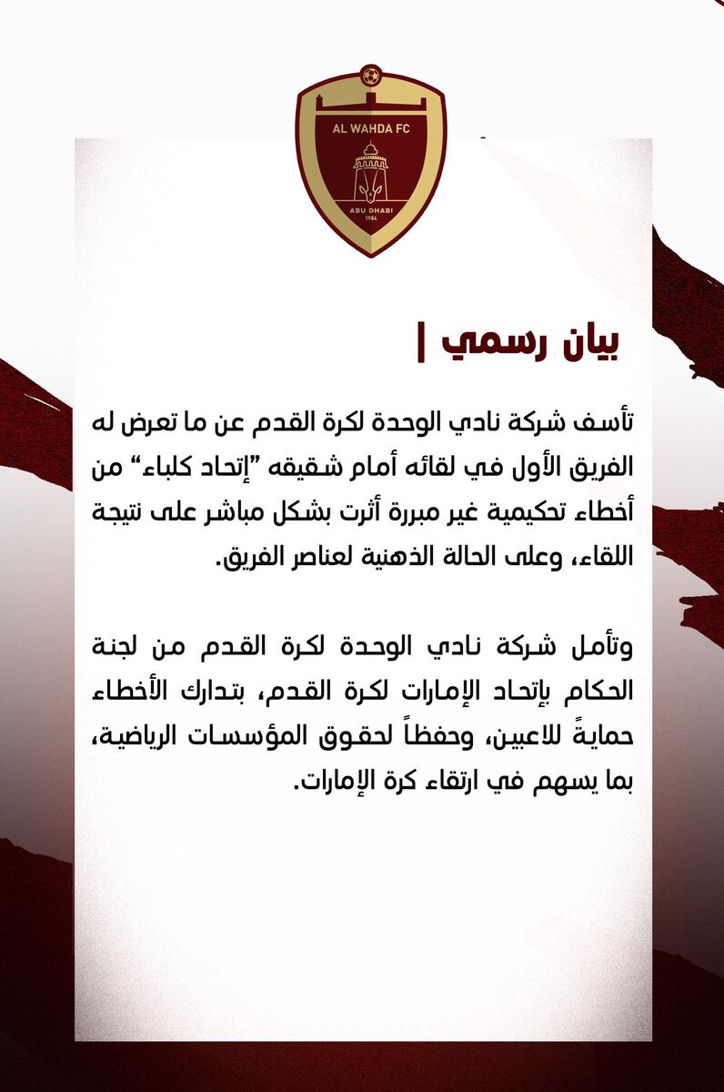 اما به نظر میرسد اولین برد مجیدی در لیگ امارات به عنوان مربی حاشیه ساز و جنجال آفرین شد. باشگاه الوحده امارات امروز با انتشار بیانیه ای از اشتباهات داوری در این دیدار شکایت کرد.