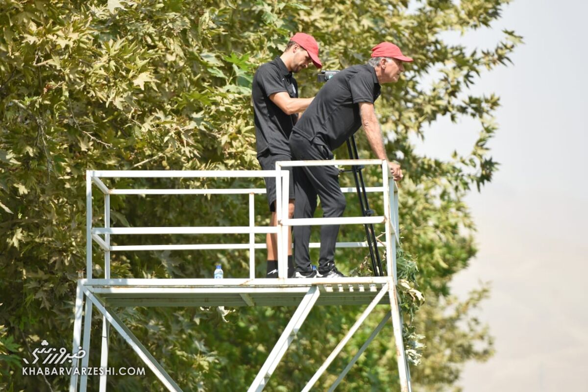 خبرورزشی: با توجه به برگزاری جلسه تامین امروز صبح تیم ملی در زمین شماره دو مرکز تیم های ملی فوتبال، کارلوس کی روش از اعضای کادر فنی درخواست کرد تصاویر تمرین را از بالا فیلمبرداری کنند. به همین خاطر یک برجک نسبتاً کوتاه متحرک، شبیه به برجک های نگهبانی پادگان های نظامی، به کنار زمین چمن کمپ تیم های ملی انتقال داده شد تا فیلمبردار کادرفنی تیم ملی بتواند از آن بالا تصاویر تمرین را ثبت و ضبط کند.