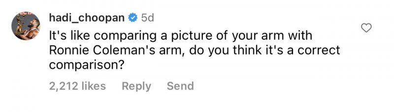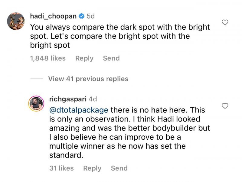 ریچ گاسپاری در پست اینستاگرامی خود با قرار دادن عکسی از عضلات پشت هادی چوپان در کنار عضلات پشت دوریان یتس آنها را با هم مقایسه کرد و در توضیح آن نوشت: "اینجا یک چیز جالب برای دیدن است. این مقایسه دوریان یتس است که در سال ۱۹۹۲ برنده مستر المپیا شد و در کنار او هادی چوپان است که به تازگی برنده مستر المپیا شده است. همانطور که میبینید ۳۰ سال پیش، قهرمانان خیلی بهتر از امروز بودند. "