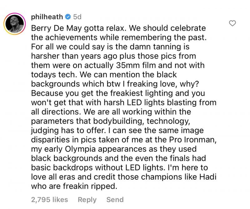 به گفته هیث، تصاویر مربوط به گذشته و حال به دلیل پیشرفت فناوری نورپردازی، متفاوت به نظر می رسد. این قهرمان افسانه ای المپیا معتقد است فناوری نور امروزه به شکلی است که از همه جهات بر بدن بدنسازان می تابد؛ بنابراین مقایسه این دو عکس درست نیست.