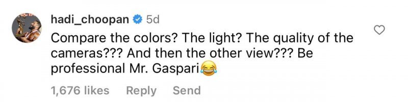 آخرین کامنت هادی چوپان زیر پست جنجالی ریچ گاسپاری هم اشاره به همین نکته و تفاوت فناوری نسبت به گذشته داشته است: "رنگها را مقایسه کنید. نور. کیفیت دوربینها و سایر زاویهها. حرفهای باشید آقای گاسپاری! "