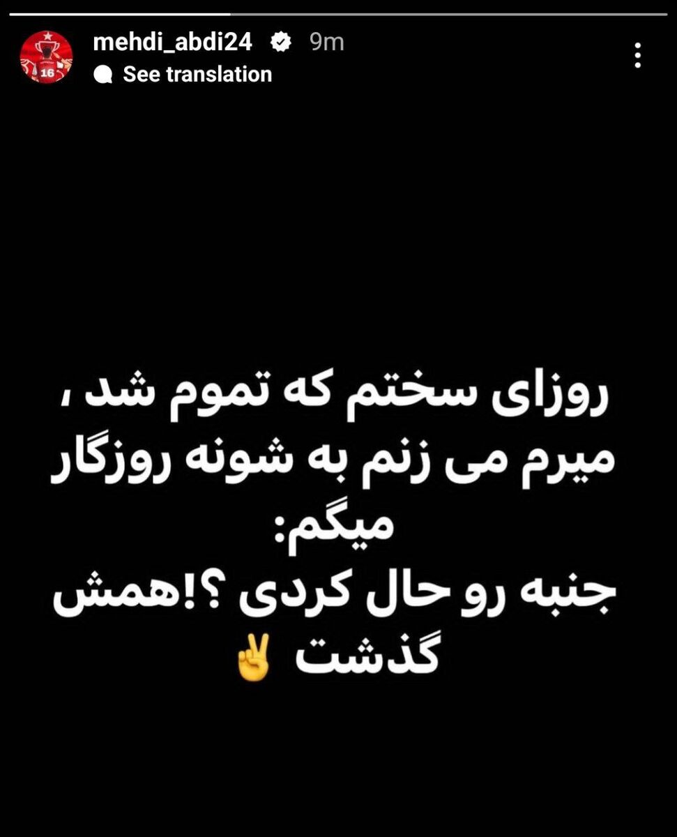 عبدی بازیکن تیم پرسپولیس یک استوری جدید منتشر کرده است. مهدی عبدی در استوری خود نوشت: «روزهای سختم که تموم شد، میرم میزنم به شونه روزگار و میگم جنبه رو حال کردی؟ همش گذشت».