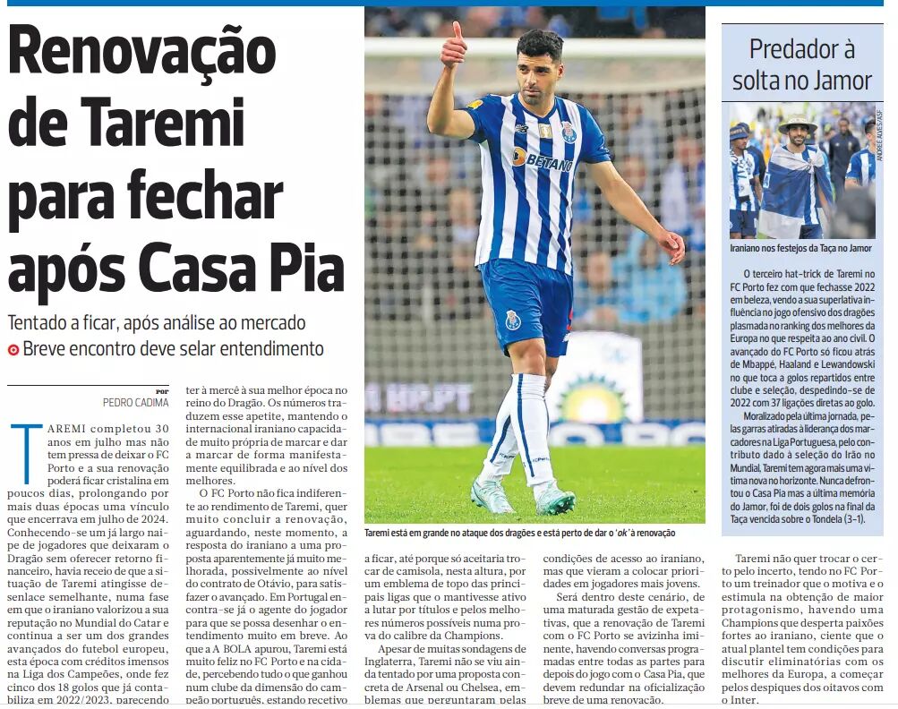 در بخشی از گزارش این روزنامه به قلم «پدرو کادیما» آمده است: «طارمی در ماه ژوئن ۳۰ ساله شد اما او عجلهای برای ترک پورتو ندارد و تمدید قراردادش که در ۲۰۲۴ به پایان میرسد، میتواند کاملاً واضح باشد؛ تمدید برای دو فصل دیگر. با علم به اینکه در حال حاضر تعداد زیادی از بازیکنان، پورتو را ترک کردهاند بدون اینکه بازدهی مالی داشته باشند، بیم آن میرود که وضعیت طارمی به نتیجه مشابهی برسد، آن هم در زمانی که این بازیکن ایرانی در حال افزایش اعتبار در جام جهانی بود. یکی از مهاجمان بزرگ فوتبال اروپا، جایی که او در فصل ۲۰۲۲ - ۲۰۲۳ از ۱۸ گلی که در حال حاضر به ثمر رسانده، ۵ گل در لیگ قهرمانان اروپا بوده است. اعداد و ارقام بیانگر این اشتها هستند و توانایی بازیکن ملی پوش ایرانی برای گلزنی به طور آشکارا در سطح بهترینها حفظ میشود.»