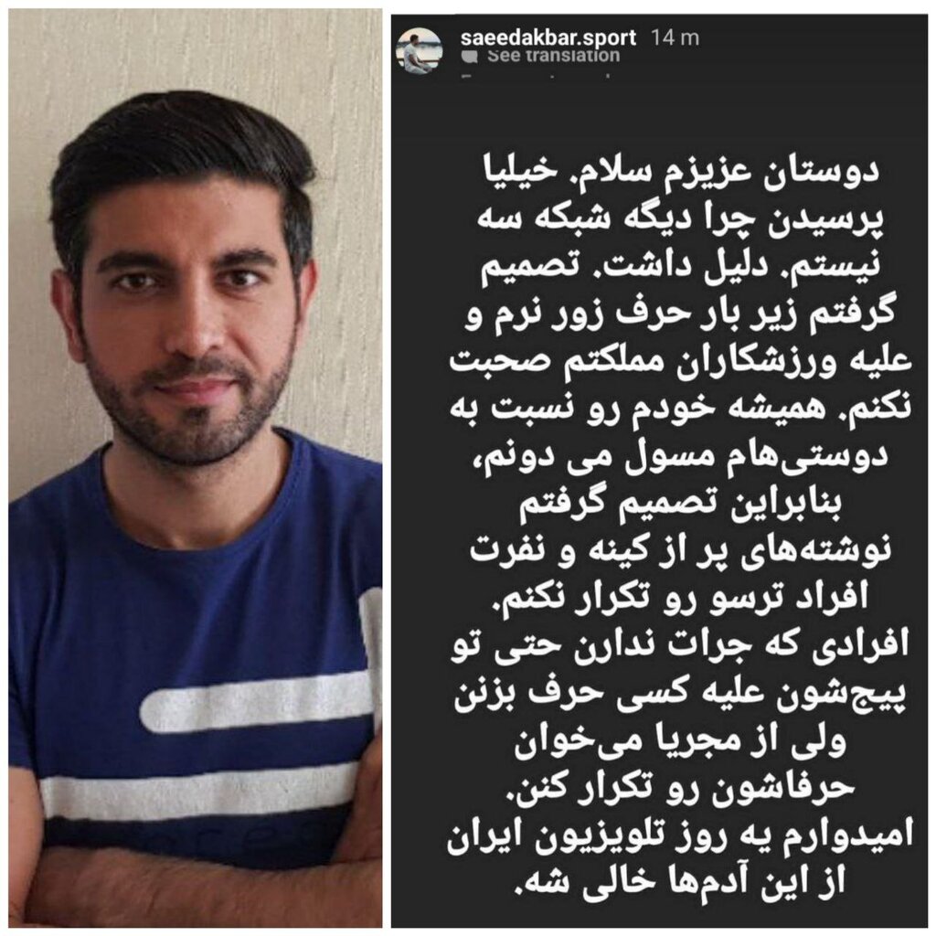 اکبری با انتشار پیامی در صفحه شخصی اینستاگرامش به دلیل غیبتش در تلویزیون واکنش نشان داد.