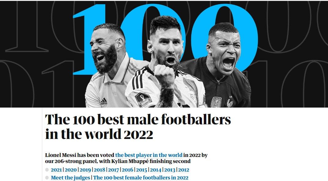 خبرورزشی: نشریه «گاردین» انگلیس لیست پایانی ۱۰۰ بازیکن برتر دنیا در سال ۲۰۲۲ را امروز منتشر کرد تا لیونل مسی ابرستاره آرژانتینی به عنوان بهترین بازیکن دنیا معرفی شود.