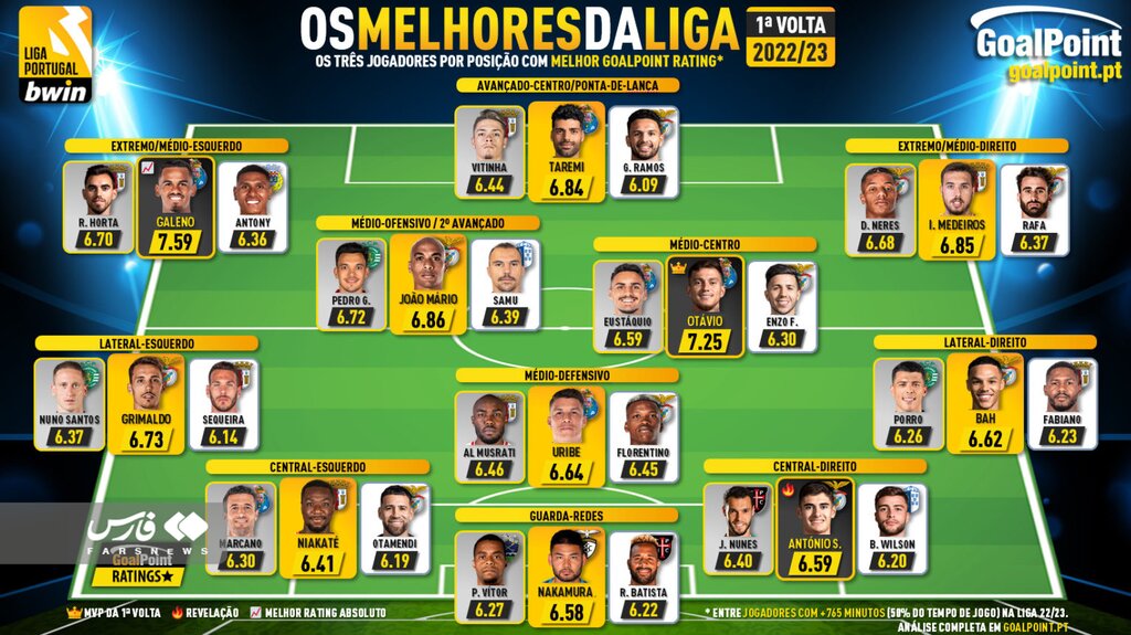 همشهریآنلاین: سایت «گل پوینت» پرتغال با اتمام نیم فصل اول مسابقات لیگ برتر این کشور به معرفی تیم منتخب متشکل از ۳۳ بازیکن پرداخت.
