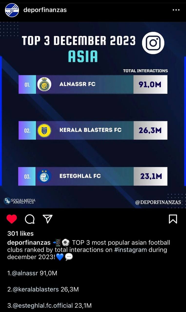 در رده بندی نهایی ماه دسامبر، باشگاه النصر عربستان که کریستیانو رونالدو را در اختیار دارد با ۹۱ میلیون اینتر اکشن رتبه اول آسیا را به خود اختصاص داد، باشگاه کرالا هند با توجه به جمعیت این کشور با بیش از ۲۶ میلیون اینتر اکشن در جایگاه دوم قرار گرفت و استقلال با بیش از ۲۳ میلیون اینتر اکشن بالاتر از باشگاه هایی چون الهلال، الاتحاد، غول های کره ای، ژاپنی و چینی در آسیا سوم شد.